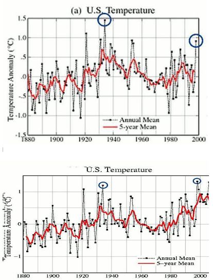 Grundsätzlich ist es schon etwas verdächtig, wenn stets die Vergangenheit künstlich kälter gemacht wird als ursprünglich gemessen. Ohne „Korrektur“ würden die heutigen Temperaturen der USA lediglich auf dem Niveau der 1930er Jahre liegen. Eine Erwärmung wäre dann für die letzten 80 Jahre nicht erkennbar. Im Gegenteil, es wäre sogar eine Abkühlung eingetreten.