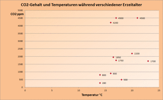 Die 11 Abstufungen, professionell als Kambrium, Trias, Jura etc, klassifiziert, umspannen einen Zeitraum von 550 Millionen Jahren durchschnittlich könnte jeder Schicht eine Dauer von 50 Millionmen Jahren zugerechnet werden,d.h. Während des Kambriums waren 50 Millionen Jahre 4500 Teile CO2 von 1.Million Teilen sonstiger Gase in der Atmosphäre und ein Durschnittstemperatur von 21 ° Danach, im Ordovizium, hatte sich die Menge CO2 um 300 Teile verringert, so daß, andere Bestandteile oder ein anderes Gas der Atmosphäre, diese 300 ppm an sich nahm, es hieß ja nun nicht X teile auf 99700Teile! Im Verlauf von wiederum 50 Millionen Jahren