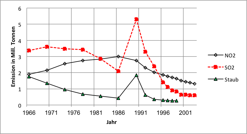 Der SO2-Eintrag ist zunächst hoch, vermindert sich dann aber infolge der Entschwefelungsanlagen bei Kraftwerken. In 1990 ergibt sich ein riesiger Anstieg infolge der Deutschen Einheit, weil die Braunkohle in den neuen Bundesländern einen sehr hohen Schwefelgehalt hat. Erst mit Neubau der Kraftwerke dort konnten die Gesamtemissionen sinken.