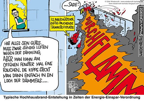 Die Gefahren lassen sich aber durchaus noch steigern: Brandgefährliche Plastikdämmung, dazu Fotovoltaik auf dem Dach, unten ein Elektroauto mit Lithiumakku in der Garage – die Feuerwehr darf dann im Brandfall mit dem kleinsten Übel anfangen. Viel Spaß!
