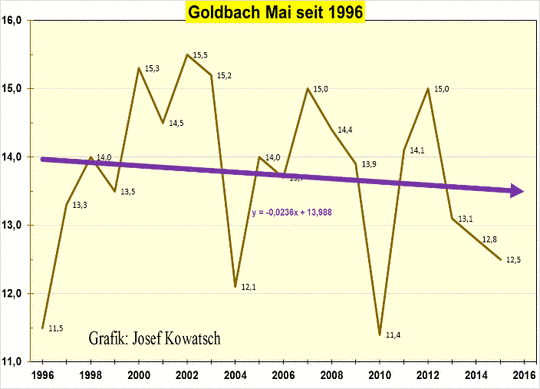 Grafik 2a: In diesem sehr kurzen Zeitraum, welchen der DWD in seinem Artikel „in den letzten Jahren“ benennt, ist der Mai in Goldbach auch kälter geworden, dies zeigt der direkte Vergleich mit Grafik 1a, die Trendlinienkennlinie wurde negativer. Zuvor y= -0,0234x, bei 15 Jahren y= -0,129x