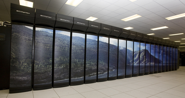 Bild rechts: Der Supercomputer Cray Ecoplex von NOAA GAEA, der für Modellierungen am Oak Ridge Lab. benutzt wird. GAEA wurde finanziert durch eine Investition von 73 Millionen Dollar im Rahmen des American Reinvestment and Recovery-Gesetzes aus dem Jahr 2009, und zwar durch eine Partnerschaft zwischen der NOAA und dem Energieministerium.