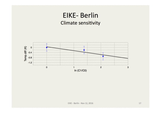 Bild 1: Ergebnis der Versuche zur Bestimmung der Klimasensitivität ECS des CO2 im Solheim Versuch anlässlich der 10. IKEK in Berlin. In wieweit die Ergebnisse auf die Atmosphäre übertragbar sind, werden die kommenden Experimente zeigen.*