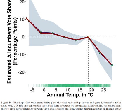 Genial und fleißig zugleich – bei Forschern zur Klimawandel-Vulnerabilität natürlich der zu erwartende Normalfall – hat dieser Professor nicht nur wie sonst üblich vor dem Computer gesessen und simuliert, sondern ist (virtuell) zu den Völkern der Welt gegangen und hat deren Wahlverhalten in Abhängigkeit von der Temperatur erkundet, wie eine Zeitung (keine Deutsche war dazu recherchierbar) berichtete: