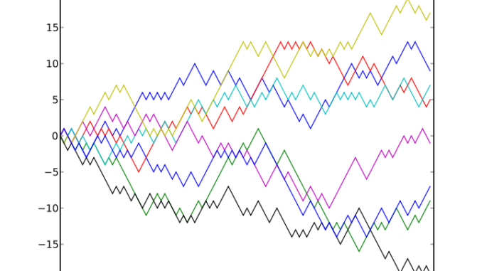 Abbildung oben: Beispiel von acht Zufallsbewegungen in einer Dimension mit dem Startpunkt 0. Der Plot zeigt die gegenwärtige Position auf der Linie (vertikale Achse) im Verhältnis zu den Zeitschritten (horizontale Achse). Bild: Wikimedia