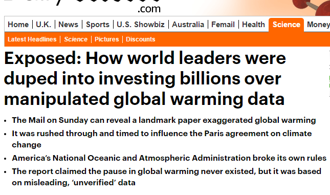 Die Gläubigen behaupteten, dass es keinen Unterschied gebe zwischen den Temperatur-Datensätzen der NOAA und von der HadCRUT, die im Rose-Artikel angesprochen worden waren, und sagen, dass die Differenz ein Grundlagen-Fehler ist. Sei’s drum, und vielleicht war es auch einfach ein Fehler der Graphik-Abteilung bei der Mail on Sunday – ich weiß es nicht.