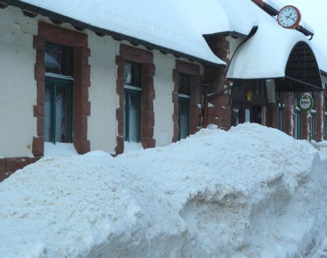 Abbildung 1: Massenhaft rätselhaftes, weißes Pulver am Bahnhof Oberhof im Januar 2017. Die Straßen im Thüringer Wald konnten nur unter großem Aufwand nach und nach geräumt werden. Weil es nach den Vorhersagen unserer „Klimaforscher“ ja keinen Schnee mehr gibt, musste es etwas anderes gewesen sein. Vielleicht hatte Frau Holle irrtümlicherweise Mehl verschüttet, aber warum war das Zeug so kalt und rutschig? Foto: Stefan Kämpfe