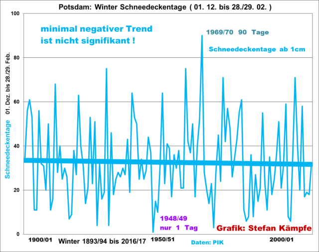 Abbildung 2: Die Anzahl der winterlichen Schneedeckentage blieb in Potsdam fast unverändert; der minimale Negativtrend ist wegen der enormen Streuung der Einzelwerte nicht signifikant. Fast schneefrei war dort (weit vor Latifs Zeiten) der Winter 1948/49; während der Winter 2016/17 eine annähernd durchschnittliche Anzahl von 32 Schneedeckentagen erreichte.