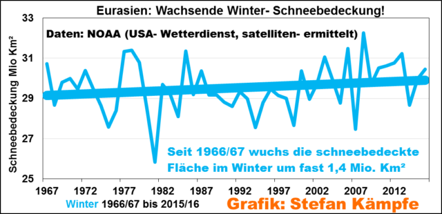 Der amerikanische Wetterdienst NOAA erfasst seit 50 Jahren unter anderem die Größe der schneebedeckten Flächen des Superkontinents Eurasien, zu welchem auch Mitteleuropa gehört. Die Werte für den aktuellen Winter, welcher eine überdurchschnittliche Schneebedeckung im Dezember und Januar aufwies, liegen noch nicht vor; aber auch so zeigt sich statt der erwarteten Ab- eine deutliche Zunahme: