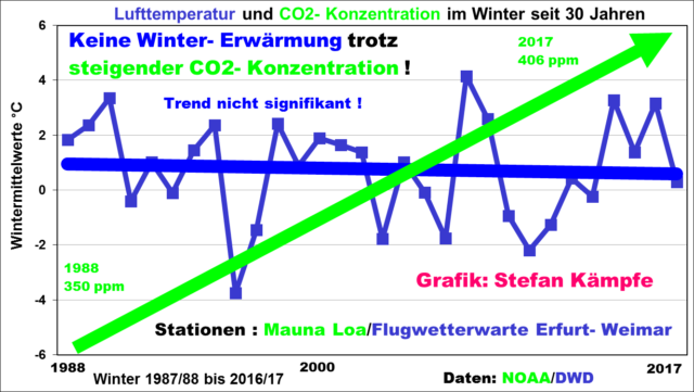 Seit etwa 30 Jahren blieb außerdem der vorhergesagte winterliche Temperaturanstieg in Deutschland aus; hier am Beispiel der DWD- Station Erfurt/Weimar gezeigt: