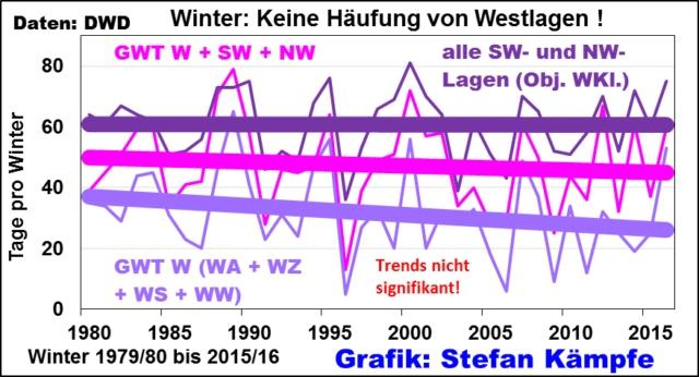 Bliebe noch die Frage mit der erwarteten Häufung der Westwetterlagen zu klären. In Deutschland werden zwei Klassifikationsverfahren zur Ermittlung der Großwetterlagen genutzt; Näheres dazu unter https://eike.institute/2016/10/19/wetterlagenhaeufigkeit-und-jahrestemperaturverhalten-in-deutschland/ . Weil die (insgesamt genauere) „Objektive“ Wetterlagenklassifikation erst seit Mitte 1979 möglich ist, beginnt die folgende Grafik mit dem Winter 1979/80. Der an Westlagen relativ arme Winter 2016/17 ist noch nicht enthalten; trotzdem zeigt sich bei allen Klassifikationsmethoden (zwei nach HESS/BREZOWSKY, eine nach der objektiven Methode) keine Häufigkeitszunahme von Westwetterlagen seit mehr als 35 Jahren: