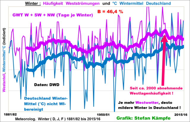 Lediglich anhand der Langfrist-Werte (verfügbar in Deutschland seit dem Winter 1881/82) könnte Herr Latif etwas Hoffnung schöpfen. Diese zeigen (noch) einen leichten Temperaturanstieg in Deutschland (allerdings nicht wärmeinselbereinigt) bei einer Häufigkeitszunahme der Westwetterlagen nach HESS/BREZOWSKY. Jedoch deutet sich auch hier die Umkehr der Entwicklung ab spätestens etwa dem Jahr 2000 an; ob diese anhält, muss aber noch abgewartet werden:
