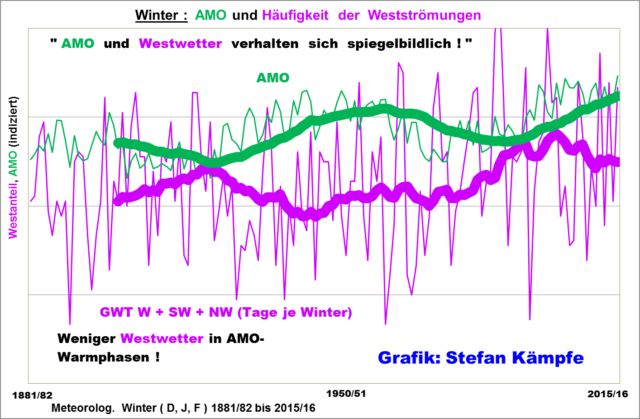 Der Winter 2016/17 war relativ arm an windigen, intensiven Westwetterlagen und deshalb zeitweise kalt. Eine mögliche Ursache hierfür ist die AMO, eine periodische Schwankung der Wassertemperaturen im Nordatlantik. In diesem Winter waren die AMO- Werte sehr hoch. Den spiegelbildlichen Zusammenhang zwischen AMO- Werten und Westlagenhäufigkeit illustriert die Abbildung 8: