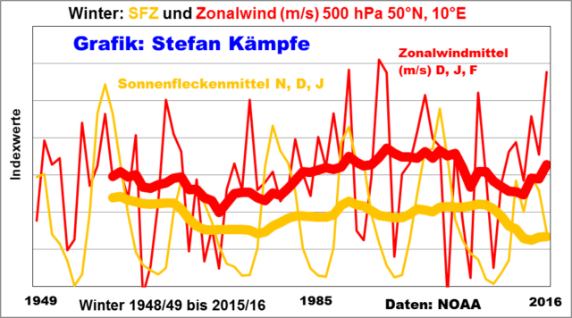 Abb. 9: Zonalwindmittel für den meteorolog. Winter (rot, oben) in der Druckfläche 500 hPa (entspricht etwa 5.500 Metern Höhe im Mittel) am Gitterpunkt 50°N und 10°E (Zentraldeutschland), dazu die Sonnenfleckenzahlen mit einem Monat Versatz früher wegen der verzögerten Auswirkung (gelb, unten) mit jeweils 11-jährigen Gleitmitteln. Man erkennt in Phasen erhöhter Sonnenaktivität tendenziell eine erhöhte Zonalwindgeschwindigkeit; wobei die Sonnenfleckenanzahl die solare Aktivität aber nur sehr grob abbildet.