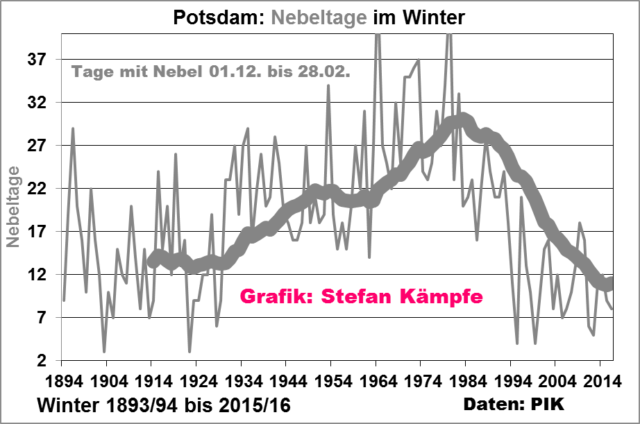 Abbildung 12: Auf dem Höhepunkt der Luftverschmutzung zwischen den 1950er und den 1980er Jahren gab es in Potsdam besonders viele winterliche Nebeltage; danach wurden sie auffallend selten.