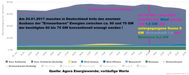 Der alte DDR- Witz von den vier Hauptfeinden des Sozialismus (Frühling, Sommer, Herbst und Winter) ist angesichts der deutschen „Energiewende“ leider aktueller denn je. Im Winter machen windschwache Hochdruckwetterlagen und die kurze Sonnenscheindauer eine ausreichende Stromversorgung aus „erneuerbaren“ Quellen unmöglich – egal, wie viele „Solar- und Windparks“ man für teures Geld zur immer weiteren Landschaftsverschandelung aufstellt, und effektive Speichermöglichkeiten fehlen in absehbarer Zeit. Die folgende Grafik spricht für sich und zeigt exemplarisch die geringe Bereitstellung von „erneuerbarer“ Elektroenergie am 24. Januar 2017; ähnliche Fälle finden sich auch im Dezember 2016 und im Februar 2017: