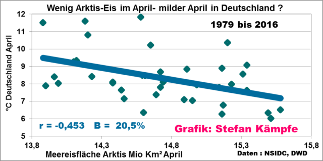 Abbildung 14: Aprilmonate mit geringer Eisausdehnung in der Arktis fallen in Deutschland tendenziell wärmer aus (negative Korrelation). Der mäßige Zusammenhang ist für eine sichere Prognose aber unzureichend; und im März und Mai fällt er deutlich geringer aus.