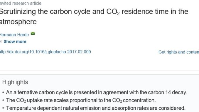 Klimawissenschaftler vermuten, dass der Kohlenstoff-Zyklus aus dem Gleichgewicht geraten ist infolge der zunehmenden anthropogenen Emissionen aus der Verbrennung fossiler Treibstoffe und dem Landverbrauch. Dies wird verantwortlich gemacht für die rasch zunehmende atmosphärische CO2-Konzentration während der letzten Jahre, und es wird geschätzt, dass die Entfernung der zusätzlichen Emissionen aus der Atmosphäre ein paar hunderttausend Jahre dauert. Da dies einher geht mit einem zunehmenden Treibhauseffekt und einer weiteren globalen Erwärmung, ist ein besseres Verständnis des Kohlenstoffzyklus‘ von erheblicher Bedeutung für alle Prophezeiungen der Klimaentwicklung in der Zukunft. Wir haben diesen Zyklus entscheidend überprüft und präsentieren hier ein alternatives Konzept, in welchem die Aufnahme von CO2 in natürlichen Senken proportional ist zur CO2-Konzentration. Außerdem betrachten wir temperaturabhängige natürliche Emissions- und Absorptionsraten, durch welche die paläoklimatischen CO2-Variationen und die derzeitige Rate der CO2-Zunahme sehr gut erklärt werden können. Der anthropogene Beitrag zur derzeitigen CO2-Konzentration beträgt lediglich 4,3%, dessen Anteil an der CO2-Zunahme während der industriellen Ära beträgt 15% und die mittlere Verweildauer 4 Jahre.