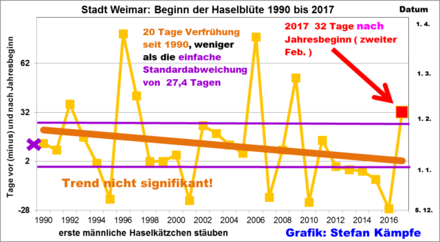 Grafik 1: Der Eintritt der Haselblüte (Vorfrühlingsbeginn) variierte in Weimar seit 1990 zwischen Anfang Dezember und Ende März. Wegen dieser enormen Streuung ist der Verfrühungstrend nicht signifikant.