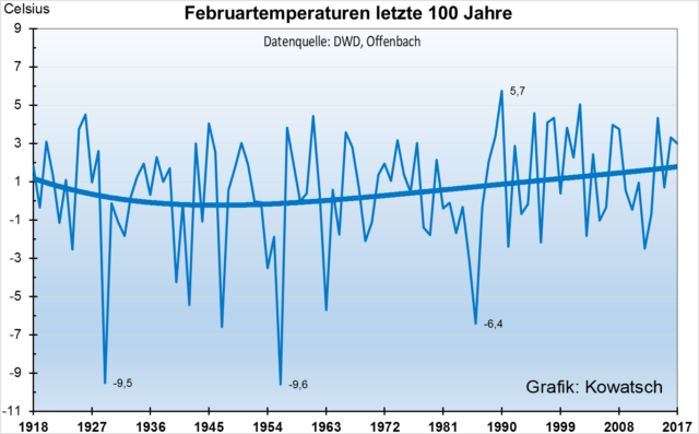 Herr Kowatsch, zu Ihrem „der Februar wird in Deutschland seit 30 Jahren kälter“ nenne ich ein paar Zahlen. Die Februar-Durchschnittstemperatur von 2008-2017 war 1,3 Grad, von 1998-2007 war sie 1,8 Grad und von 1978-1987 war sie 1,7 Grad. Im Mittel der letzten 30 Jahre also 1,6 Grad (Quelle http://tinyurl.com/gmryx6b). Die Februar Temperatur dieses Jahres war 2,9 Grad. Langfristig zeigt sich Datenlage noch deutlicher, 30-jähriges Mittel, 1988-2017: 1,6, 1958-1987: 0,1, 1928-1957: -0,5. Noch zu „Die Erwärmungsgläubigen haben einen Anstieg der Wintertemperaturen vorhergesagt“. Ja, aber sie sind nicht so dumm, den sehr warmen Februar 2017 als Beweis dafür zu nehmen oder sich von ein paar herausgepickten Rosinen blenden zu lassen. Vielmehr gibt es eine erdrückende Flut von Fakten, die den Trend zu einer langfristig globalen Erwärmung belegen.