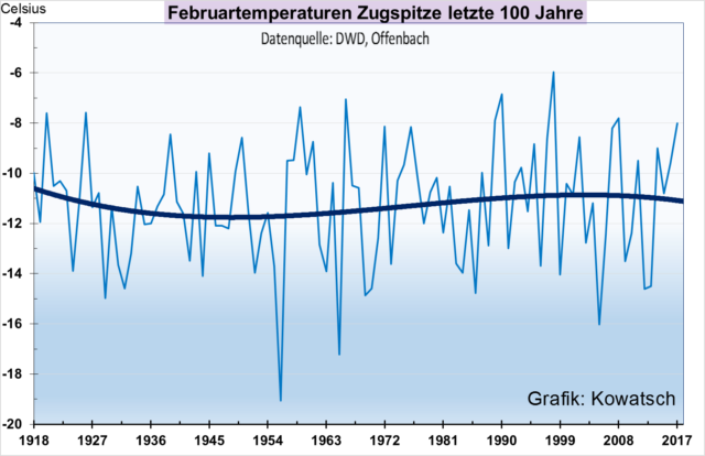 Ergebnis: Die Zugspitze als weniger mit Zusatzwärme aus den Wärmeinseln beeinflusste Wetterstation zeigt über die letzten 100 Jahre gar keine Erwärmung. Trotz eines mit – 7,8C relativ warmen Februars 2017 im Vergleich zu den Vorjahren.