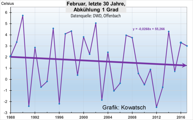 Grafik 4: Der Monat Februar wurde in den letzten 30 Jahren kälter in Deutschland, das zeigen die vom Deutschen Wetterdienst bzw. von den einzelnen Stationsleitern sorgfältigst erhobenen Temperaturdaten. Allerdings sind die Daten nicht wärmeinselbereinigt, sonst wäre die Trendlinie noch fallender.