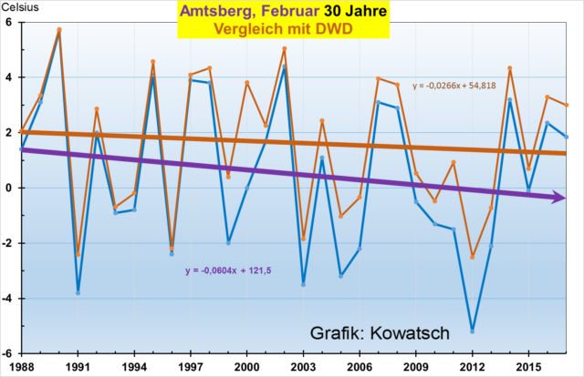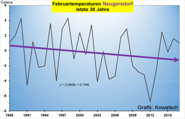Wieder – wie schon beim Monat Januar – sind die Leser aufgerufen, bei ihrer Heimatwetterstation nach den Temperaturdaten der letzten 30 Jahre zu forschen und deren Trendlinienverlauf bei den Kommentaren uns zu melden. Genauso sind die Leser aufgerufen, ihre Tageszeitungen auf das Kälter werden des Monates Februar hinzuweisen. Wir bitten die Leser, sich die Falschmeldungen der Medien nicht weiter gefallen zu lassen. Weil es im Januar und Februar kälter wurde müssen logischerweise auch alle zeitigen Frühjahrsblüher verspätet sein. Das werden wir in einem unserer nächsten Artikel zeigen. Schließlich blüht das Märzenveilchen immer noch oder wieder im März wie zu Mozarts Zeiten.