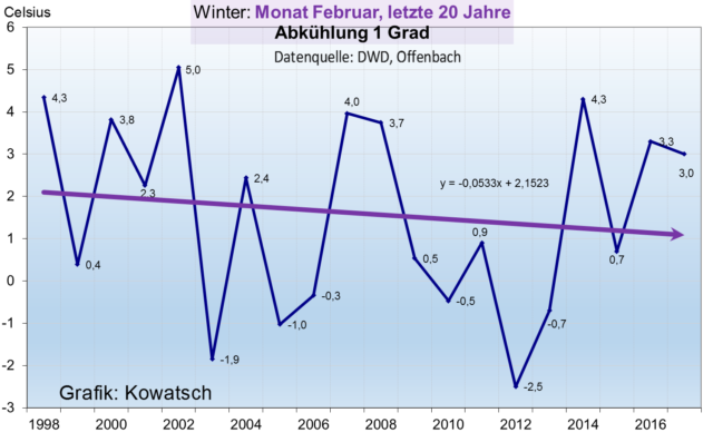 1) Die Erwärmungsgläubigen haben einen Anstieg der Wintertemperaturen vorhergesagt. Und genau das Gegenteil ist eingetreten. Seit 30 Jahren fallen die Februartemperaturen in Deutschland, trotz des CO2-Anstieges. Und seit 20 Jahren ganz rapide.