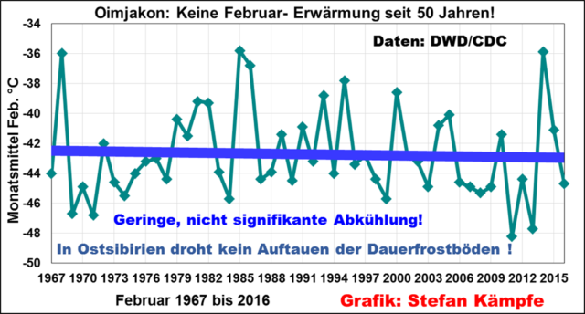 Grafik 8: Am kältesten, dauerhaft bewohnten Ort der Erde (Oimjakon, etwa 700 Einwohner, gelegen in einem Hochtal des ostsibirischen Berglandes) gibt es schon seit 50 Jahren keine Februar-Erwärmung. Der Februar blieb hier unter minus 42 °C kalt. Für 2017 liegen noch keine Werte vor.
