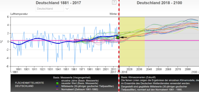 Der vom DWD gepflegte Deutsche Klimaatlas sieht den Verlauf des Winters wie folgt (Bild 7). Drastisch erkennbar sind in den Simulationsverläufen die bereits aktuell vorhandenen Fehler mit einer Spanne von bereits über 2 °C, so viel wie die gesamte Mittelwertvariabilität seit Beginn der Messreihe . Das Einzige, worin sich die Simulationen „einig“ sind, ist, dass es immer weiter wärmer werden muss, weil sie es aus dem kurzen Anstiegs-Vorlauf so „gelernt“ haben. Von Klimazyklen scheinen diese Simulationen erkennbar nichts zu wissen.