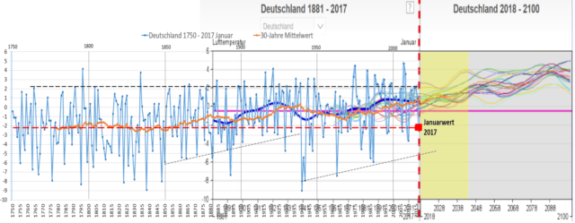 Bild 8 Temperatur-Verlauf des Januar seit 1750 mit darüber kopierter Januar-Grafik aus dem Deutschen Klimaatlas.