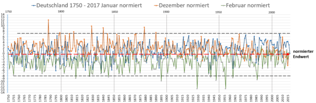 Interessant wird es, wenn man den Temperaturverlauf der drei Wintermonate in Deutschland auf den Endwert 0 normiert und übereinander legt (Bild 9). Dadurch zeigt sich, dass die Wintermonate im Grunde seit dem Jahr 1750 gar keine wirklich signifikanten Veränderungen bilden und alles dazwischen einfach natürliche Klima-Schwankungen sein können.