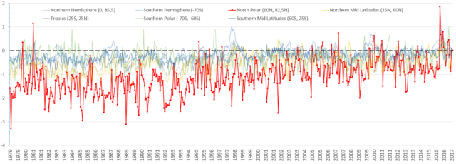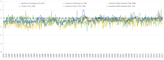 Was man im Bild 10 schon sieht, wird beim „Aufdröseln“ noch deutlicher: Seit 1979 (Beginn der Satellitenaufzeichnungen) hat sich ausschließlich die Gegend um den Nordpol (roter Verlauf) wirklich erwärmt, der große Rest der Welt aber nicht. Bild 11 zeigt dazu die Temperaturverläufe vom „Rest der Welt“ ohne „North Polar“. Nicht nur dies eine Erscheinung, welche eklatant der CO2-Theorie und der überall publizierten „Überhitzung“ des Planeten durch unseren CO2-Ausstoß widerspricht.