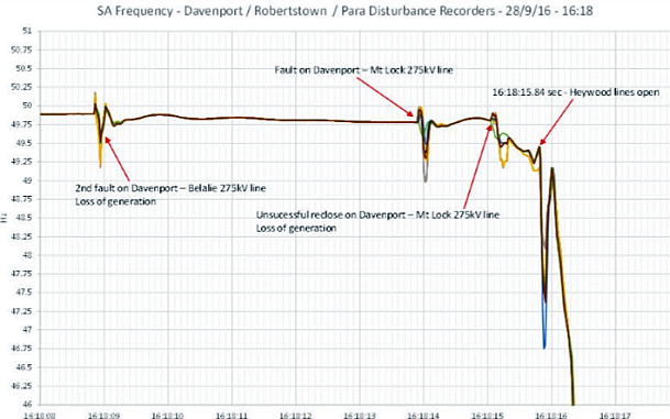 - Vereinfachte Kurzfassung: Blitzeinschlag in drei Verteilstationen, Ausfall der gesamten Windenergie, Überlast der noch funktionierenden Verbindungen konventioneller Kraftwerke, Die Verbindung aus dem Nachbarland Victoria wurde auch überlastet und schaltete ab.
