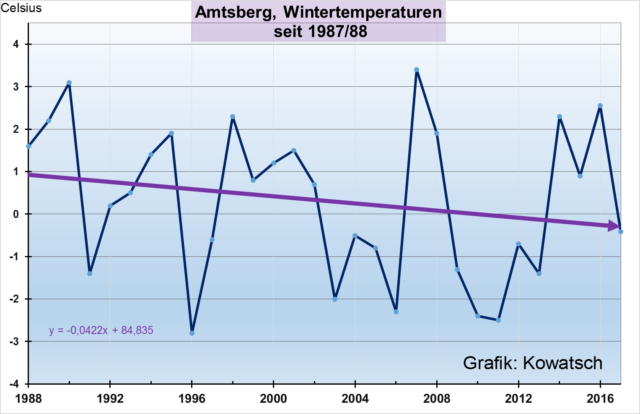 Grafik 6: „Deutschland wird keine Winter mehr erleben. Die Grafik zeigt was anderes. Auch in der Gegenwart sind die Winter kälter geworden. Die Trendlinie ist leicht fallend. Der Mann rechts oben in der Grafik irrte gewaltig.