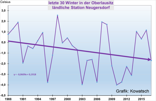 Grafik 2: Innerhalb des letzten Wärmeplateaus, also innerhalb der letzten 30 Jahre zeigt der Winter in Deutschland eine leichte Tendenz zur Abkühlung. Abkühlung ist das Gegenteil von Erwärmung.