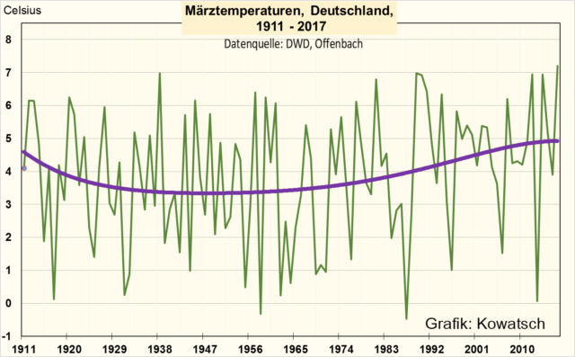 Betrachtet man die von DWD verfügbaren Daten ein paar Jahre länger, so sieht man das dieses Jahr mehr oder minder das Ende eines Erwärmungstrends für den März darstellt. Das Temperaturniveau hat sich von ca. 2,7 auf 3,5 Grad erhöht. Und dieses Temperaturniveau wurde bis Ende der 1980 gehalten. Mittlerweile ist da Temperaturniveau auf ca. 4,5 Grad gestiegen. Damit ist es ca. 1 Grad höher als die Märztemperaturen um ca. 1910.