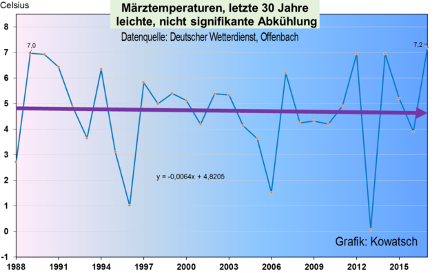 Und was haben Sie mit viel Zeitaufwand dann gezeigt: Nicht anderes als den von mir, Herrn Kämpfe und Herr Leistenschneider ständig behaupteten Wärmeinseleffekt in den DWD-Temperaturreihen gesucht und bestätigt. Dass diese Erwärmung auf CO2 zurück zu führen ist, werden auch Sie nicht beweisen können. Schauen Sie sich den Hohenpeißenberg in Grafik 3 an, wenn sie im Märzverlauf ab 1970 die 0,5C WI-effekte rausrechnen, dann …. Aber die Bebauung des Berges ist heute so wie sie ist und nur die hat zusammen mit der Standortänderung zu dem kleinen März-Erwärmungstrend seit 1950 geführt. Oder die Dale-Enterprise, da müssen sie nichts rausrechnen. Was glauben Sie wie die Trendlinie von dem nur 100 km entfernten Washington aussieht. Herr Kämpfe hat es ausgerechnet, seit 1981 sind in Washington die Temperaturen um 1 Grad gestiegen in Dale Enterprise um denselben Betrag gefallen. CO2 bewirkt gar nichts oder fast nichts. Es geht um Umwelt und Naturschutz und nicht um das Geschäftsmodell Klimaschutz. Die Lüge „wärmster März aller Zeiten hilft weder der Natur noch der Umwelt, aber diese Lüge hilft dem Geschäftsmodell Klimaschutz. Unsere Behauptung ist weiterhin, die Erwärmung in den deutschen Zeitreihen seit 1881 ist hauptsächlich auf den Wärmeinseleffekt zurück zu führen und hier im Artikel, trotz Wärmeinseleffekt der meisten DWD-Stationen sind beim Monat März die Temperaturen in den letzten 30 Jahren leicht gesunken. Und das zeigt die Forsythie in Hamburg und das Märzenveilchen außerhalb von Hüttlingen.