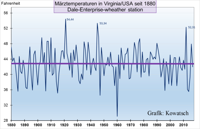 Werfen wir zum Abschluss noch einen Blick in die USA, die Dale-Enterprise-Station ist die älteste Messstation in Virginia und steht seit der Errichtung kurz nach dem amerikanischen Bürgerkrieg einsam bei einer Farm auf dem Land. Gemessen wird dort in der Maßeinheit Fahrenheit.