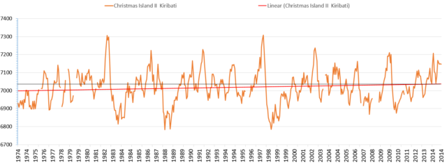 Bild 11 Pegelverlauf von Kiribati, Christmas Island II. Daten vom Autor aktuell vom PSMSL-Viewer geladen und als Diagramm umgesetzt