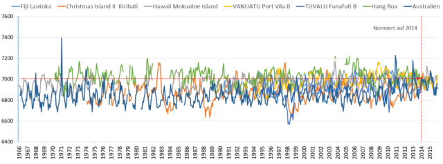 Der Pegelverlauf des südlichen Pazifik gilt allgemein als ein Fingerzeig des zerstörenden Klimawandels. Deshalb sind die folgenden Pegeldarstellungen auch unter diesem Gesichtspunkt bewerten.