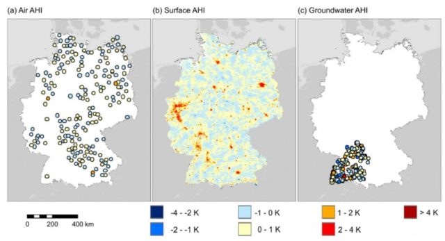 Abb. 2: Anthropogenic Heat Intensity (AHI) in Deutschland. a) Wetterstationen (“Air”), b) Satellitenmessungen (“Surface”), c) Grundwasser. Quelle: Abb. 4 aus Benz et al. 2017.