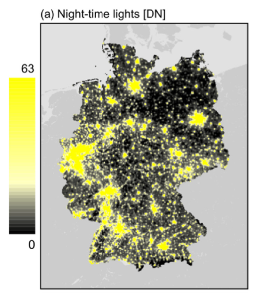 Schließlich dann noch ein letzter Versuch mit einem vielleicht überraschenden Datensatz, einer Karte der nächtlichen Lichtintensität Deutschlands (englisch: “Nighttime lights”). Die Idee ist gar nicht so abwegig: Wo viel Licht ist, herrscht viel menschliche Aktivität. Diesmal traf der Pfeil ins Schwarze. Der statistische Pearson Korrelationskoeffizient von Satellitentemperaturen und Nachtlicht ergab beachtliche 0.55. Stärkere Nighttime Lights scheinen die Temperatur also zu erhöhen. Wiederum scheinen die Daten für begabte Datentüftler von der NOAA-Webseite frei herunterladbar zu sein. Konkret handelt es sich um (Auszug aus dem Paper):