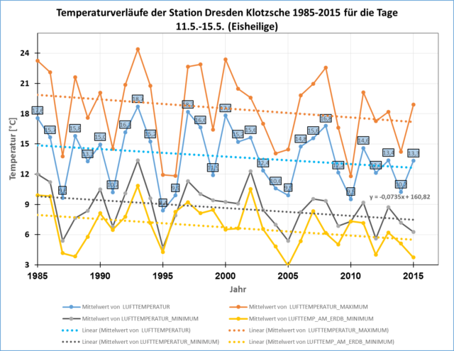 Die zweite Grafik kommt aus Dresden Klotzsche, genauso wie Potsdam eine offizielle Messstation des Deutschen Wetterdienstes. Herr Samuel Hochauf hat neben dem Temperaturmittel der fünf Tage in Blau auch noch die Maximaltemperaturen, die Minimumtemperaturen und auch die Minimumtemperaturen in Bodennähe (5cm) seit 1985 dargestellt bis 2015. Der fünf Tagesmittel der Eisheiligen für 2016 betrugen 12,88C, genau auf der Fortsetzung der blauen Linie. Die Grafik scheint zunächst etwas unübersichtlich, dem ungeübtem Betrachtet sei empfohlen, zunächst mit der blauen Betrachtung zu beginnen, das sind die üblichen Durchschnittstemperaturen der Eisheiligen seit 1985