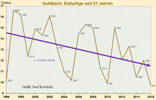 Und schließlich Goldbach bei Bischofswerda, die Klimastation gibt es erst seit 1996, aber auch dort werden die Eisheiligen kälter. Die ungenauen Angaben der DWD-Vorstände mit „in jüngster Zeit“ oder „in der „Gegenwart“, könnte man vielleicht die letzten 20 Jahre meinen. Aber auch in jüngster Zeit ist das Ergebnis eindeutig, die Eisheiligen werden kälter. Je kürzer der Betrachtungszeitraum, desto fallender die Trendlinien. Fallende Temperaturtrendlinien sind das genaue Gegenteil von Erwärmung. Und damit können die Eisheiligen in jüngster Zeit auch nicht zu Heißheiligen geworden sein. Wir bitten die Leser, bei entsprechenden Falschmeldungen sofort bei ihren Tageszeitungen aktiv zu werden.