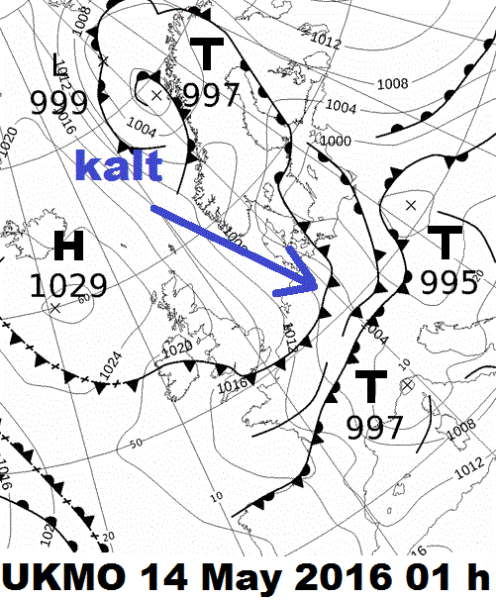 Abbildung 1: Nordlage am 14. Mai 2016. Tagsüber wurden kaum mehr als 10 bis 13 Grad erreicht; in den Mittelgebirgen gab es Schnee- und im Flachland Graupelschauer. Größere Frostschäden blieben aber aus, weil die Luftmasse (Arktische Meeresluft) relativ wolkenreich und der Wind stark war, so dass die nächtliche Abkühlung moderat ausfiel.