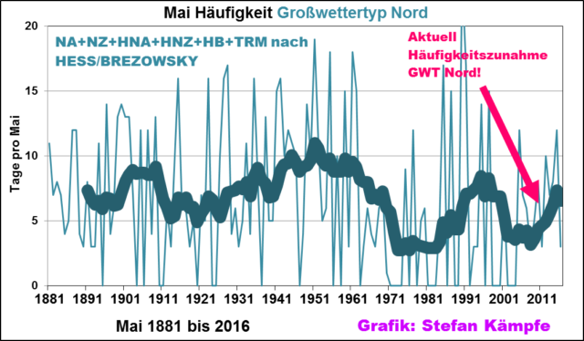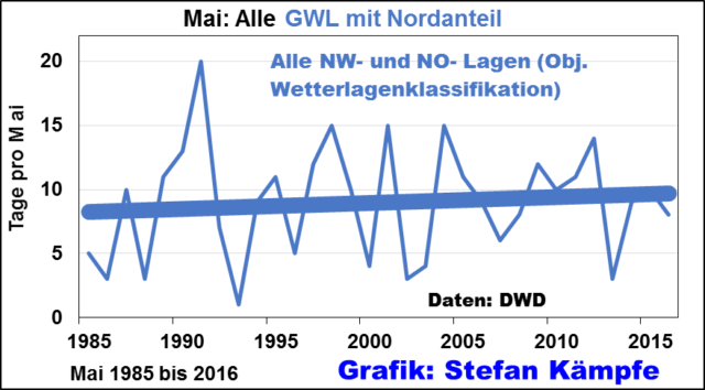 In dem hier gewählten kurzen Untersuchungszeitraum ab 1985, welcher wegen der starken Streuung der Häufigkeiten der Großwetterlagen keine signifikanten Aussagen zulässt, nahm die Häufigkeit der Nordlagen im Mai leicht zu, was eine höhere Wahrscheinlichkeit für deren Auftreten auch im Mai bedeutet: