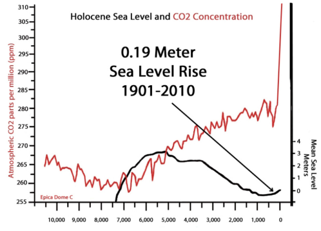 Bild 4 Langfristiger globaler Meerespegelverlauf und CO2-KOnzentration. Quelle: No Tricks Zone: AGW ‘Disaster’ Predictions Recycled