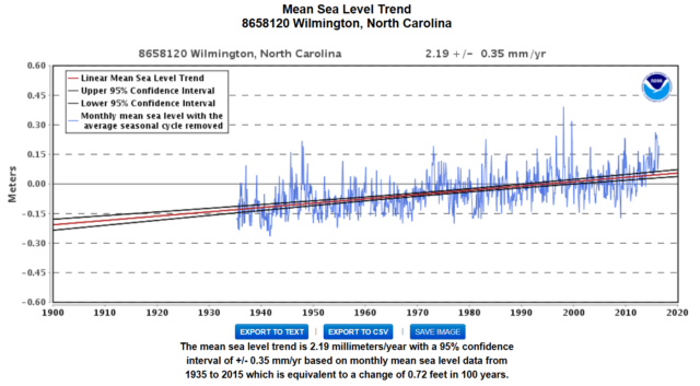 Ausgangspunkt ist ein kontroverser Bericht, den eine Expertengruppe der Küstenkommission von North Carolina im Jahr 2010 erstellt hatte. Hierin wird vorgeschlagen, einen Meeresspiegelanstieg von einem Meter bis 2100 für Planungszwecke anzunehmen. Dies ist deutlich mehr als die aktuelle Anstiegsgeschwindigkeit erwarten ließe. Laut Pegelmessungen steigt der Meeresspiegel in North Carolina derzeit nur um etwa 2 mm pro Jahr an, und wenn man den Satellitendaten glaubt um 3 mm/Jahr. Dies würde bis 2100 lediglich einen Anstieg von 20-30 cm ergeben. Nun nehmen die Autoren des Berichts jedoch für die Zukunft eine signifikante Steigerung der Anstiegsgeschwindigkeit an. Begründet wird dies mit der laut IPCC zu erwartenden starken globalen Erwärmung, was sich durch Wasserausdehnung und Eisschmelze in gesteigerte Meeresspiegelanstiegsraten übersetzen würde. Im Bericht wird hierzu eine Arbeit von Stefan Rahmstorf vom Potsdam-Institut für Klimafolgenforschung (PIK) zitiert. Auch wird Bezug genommen auf die Doktorarbeit des Amerikaners Andrew Kemp, der geologische Studien in den Salzmarschen von North Carolina durchführte und zu Beginn des 20. Jahrhunderts eine Beschleunigung des Meeresspiegelanstiegs nachweisen konnte. Die Beschleunigung war dabei durchaus zu erwarten, da dies den Übergang von der Kleinen Eiszeit zur Modernen Wärmeperiode darstellt. Eine weitere Beschleunigung während der letzten 30 Jahre konnte hingegen nicht festgestellt werden …