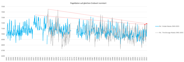 Bild 8 [3] Tidenpegelverlauf Station Adak(5), Anchorage (7) auf den gleichen Endwert normiert. Vom Autor anhand der PSML-Daten erstelle Grafik